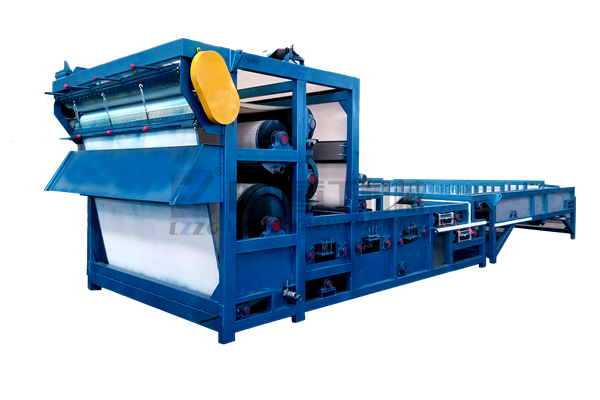 物料脫離楔形區就進入壓力區,物料在此區內受擠壓,沿濾帶運行方向壓力隨擠壓輥直徑的減少而增加,物料受到擠壓體積收縮,物料內的間隙游離水被擠出,此時,基本形成濾餅,繼續向前至壓力尾部的高壓區經過高壓后濾餅的含水量可降至Z低。